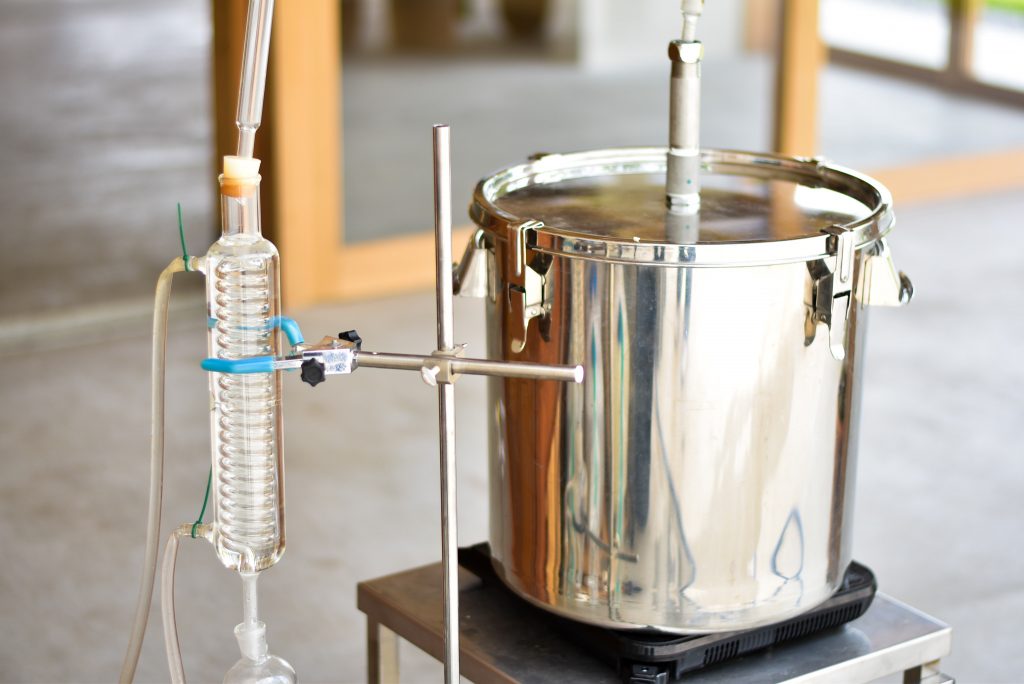 さて、生花を心ゆくまで堪能したあとは、蒸留の準備です。蒸留の器具はこちらを使用します。これは蒸気の気化によって精油を抽出する「水蒸気蒸留法」ですが、HANAを含め多くの精油がこの方法で抽出されます。
