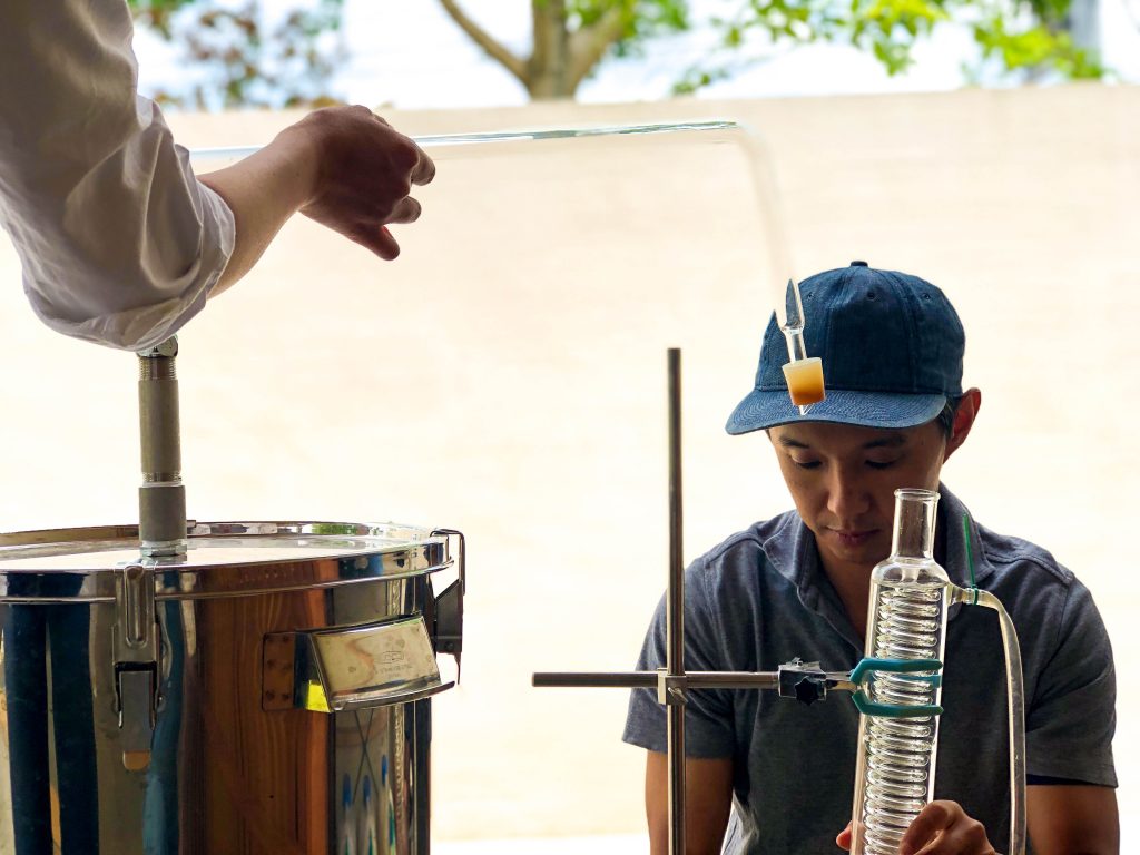 このとき、発生した水蒸気は釜から伸びた管を通って、くるくるの渦巻きの構造をした「冷却器」に向かいます。ここでその蒸気を再び水で冷やすことによって液体に戻します。