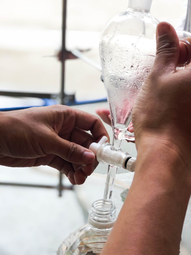 一方、蒸気が液体に戻る際に、水に溶けない性質をもつ精油は水と分離して二層になって抽出されます。