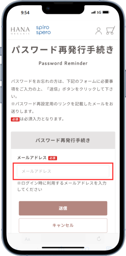 ②ご登録いただいているメールアドレスを入力し、「送信」ボタンを押します。