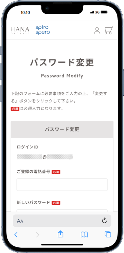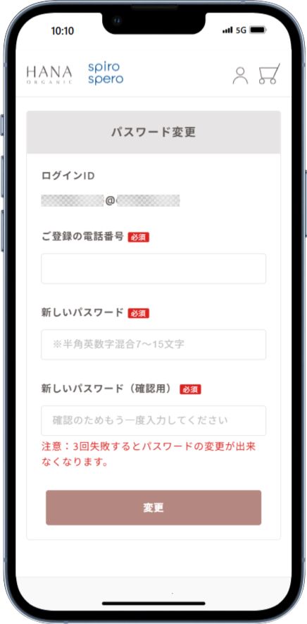 ご登録のお電話番号と、新しいパスワードを入力後、「変更」ボタンを押してください。