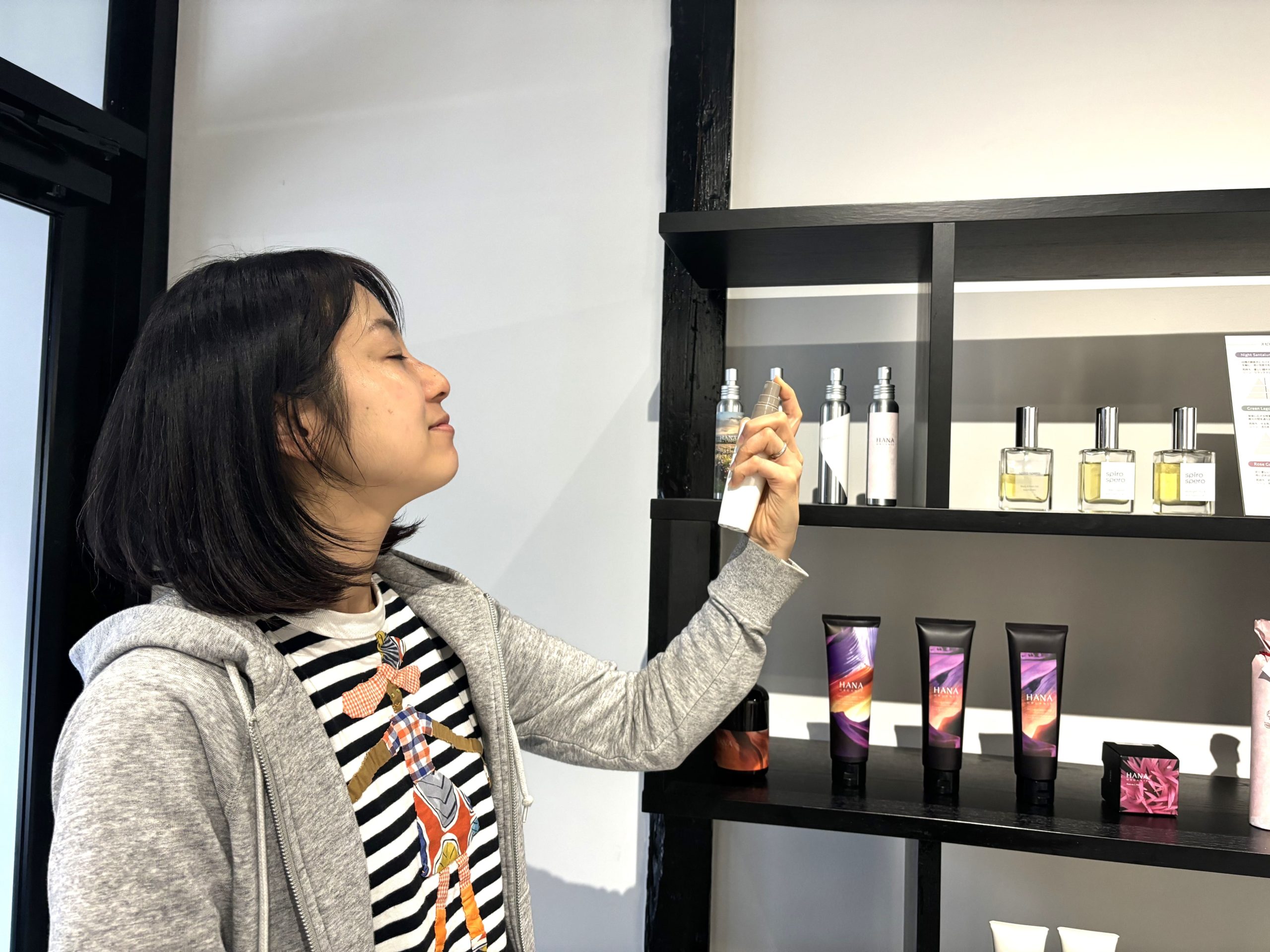 HANAのスタッフもちょっと肌が乾燥してるかなという時や、仕事が忙しくて少しリラックスしたいなという時には、オフィスでフローラルドロップをシュシュッとして香りを嗅ぎ、『リラックスして肌も整える』を実践しています。