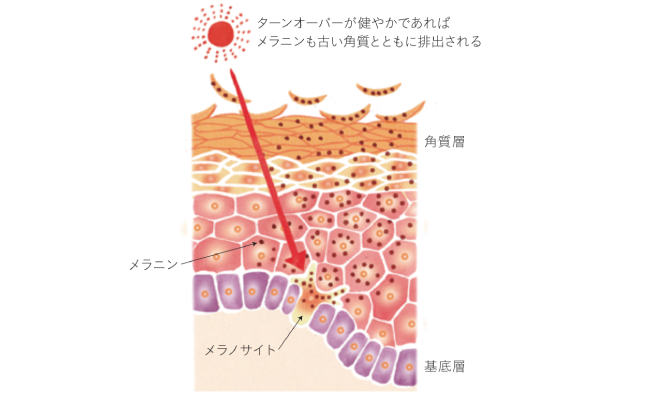 実際に、夏に日焼けをしてしまっても秋が深まるころにはすっかり色が元に戻っているように、メラニン色素を含む肌細胞がいつまでも肌にとどまることはありません。