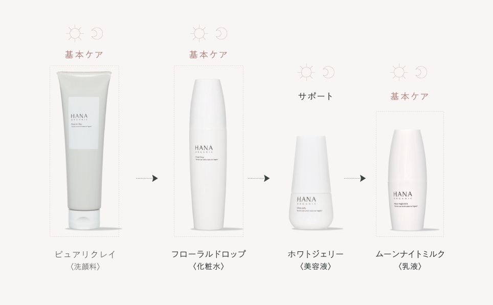 ①洗顔→②フローラルドロップ→③【ホワイトジェリー】→④ムーンナイトミルク