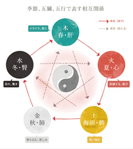 木が成長するときのような伸びやかな性質。季節では春、方角では東。五臓では巡りを調整する「肝」が対応します。イライラなど怒りの感情が激しくなると「肝」に不調が生じる。