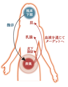 一生のうちに分泌されるのはたったスプーン1杯分と言われるほどの微量ですが、これが血液によって全身に運ばれることで肌のツヤ、髪の潤いを作り出し、女性らしいボディライン、妊娠、出産、授乳すべてのスイッチとなる「強烈な液体」です。