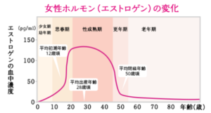 一生のサイクルで見ると、10代で急激にエストロゲンの分泌が高まり、20代、30代前半までがピーク。30代後半から40代では今度は思春期と同じ角度で急激に分泌量が下がっていきます。この10代と40代のジェットコースターのような大きな波によって思春期、更年期の身心はグラグラと揺さぶられることになります。
