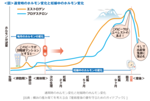 また妊娠中、授乳中の女性ホルモン変化は、その山のピークが普段はなだらかな丘くらいなものが富士山レベルになってきて、それが急激に上がり下がりを起こすので、生理前の憂鬱の何十倍もの身心の変化が訪れます。