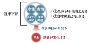 女性ホルモンは視床下部からの指令で分泌されますが、視床下部には他にも自律神経をコントロールする役目と、本能(睡眠、食事、排泄など)や感情をコントロールする役目もあります。