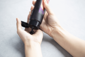 塗れた髪ではなく、乾いた髪に、最初は3回連続で使って色を定着させることがポイントです。歯ブラシに歯磨き粉を載せるように専用のブラシにカラーコンディショナーを出して、気になるところに塗っていくだけ。手を汚すこともありません。その後、ヘアキャップやラップをまいて20分~30分時間をおいて流します。