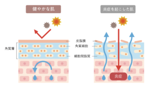 こういった刺激物がやってくると、肌は「異物が来た!」と反応して、サイレンを鳴らし、それに何とか対応しようと炎症を起こします。その結果として陥没(しわ)が起きてみたり、乾燥やシミができてしまうのです。ここでいうサイレンと炎症の関係は細菌やウイルスに対して免疫機能が反応し体を発熱させる仕組みと同じ。刺激に対して反応すること自体はごく自然なことなのです。
