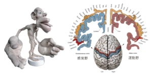 上のイラストはペンフィールドのホムンクルスと言い、敏感なところ(=大脳皮質で大きな面積をしめるところ)は大きく、鈍感なところは小さく描かれています。