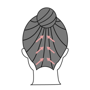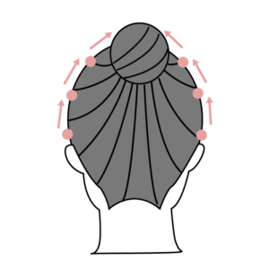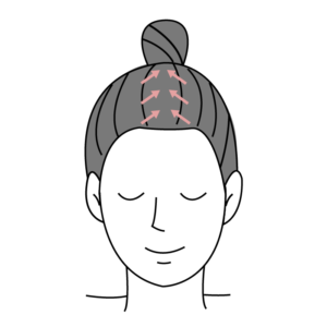 ②額、生際のあたりから頭頂部に向かって、皮膚を中心に向かって押し上げるようにマッサージ
