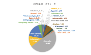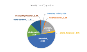 両年ともそれ以前のものと違っていてゲラニオールが高くなっています。これは私たちが、「自然や大地を感じるパワフルな香り」「エネルギーに溢れている」と感じている原因かもしれません。