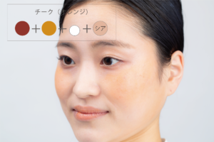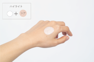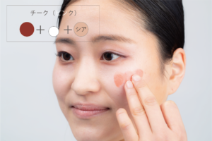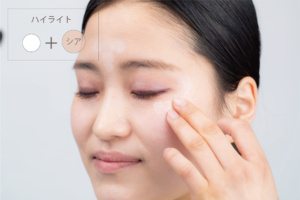 たっぷりのシアーと少量の白を混ぜて、瞼やCゾーン、Tゾーン、小鼻の両脇など明るく見せたいところに。