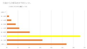 HANA ORGANIC が実施したアンケート結果によると、白髪染めを始める年齢はおよそ30代から。そして、白髪染めを卒業してもいいかなと思う年齢はおおよそ65歳。つまり多くの女性が25年もの間、白髪染め生活に追われるということです。