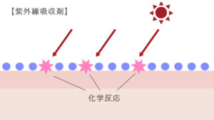 「吸収剤」は文字通り紫外線を吸収して化学的に熱などに変化させて放出するタイプのもので、肌の上で化学反応が起き、皮膚への刺激となることがあります。