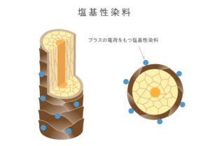 イオン結合によって髪を染める染料のこと。塩基性染料が持つプラスの電荷と、髪表面のマイナス部分が結合することによって髪が染まる。HC染料と比べて分子量が大きく、髪内部へ浸透することはできないため、基本的にHC染料と一緒に配合されることが多い。