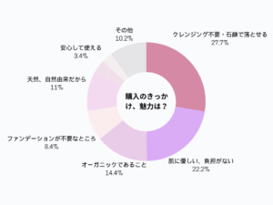 購入のきっかけは「クレンジング不要で石鹸で落とせる」ということが一番の魅力と回答いただきました。HANA オーガニックの特徴である「肌へのやさしさ」や「オーガニック」という点も購入のきっかけになっているようです。