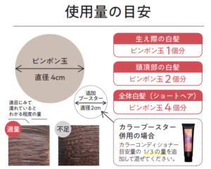 特に初めて使用する際には、下記図を目安に「これ多すぎるかな?」という位の量をたっぷり使いましょう。たっぷり使用することで、染まりも色持ちもアップします。