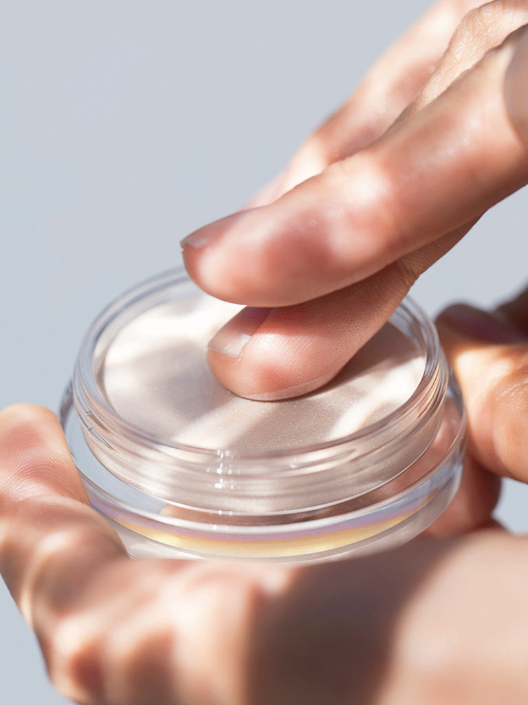 1. 指の腹で少量をなぞるようにとり、きらめきたい場所に塗ります。自分の気持ちが高まる、いきいきとした表情が生まれるところにパールの輝きを載せてみてください。